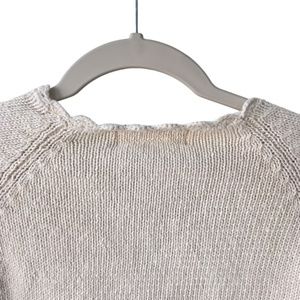 Features: a beautiful, creamy, beige tone. Different types of knit patterns all throughout. From fisherman style to lace style to a textured, embroidered floral pattern on the sleeves. The cuff and hem is really beautiful and looks almost like a chunky knit lace. A nice and thick cotton material very sturdy.