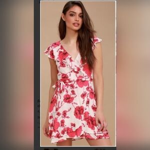 Features: wrap dress with ribbon tie adjustable waist, ivory white with pink and black floral print, v-neck, layered ruffled skirt, ruffled sleeves and neckline, short sleeves, mini dress, 100% viscose