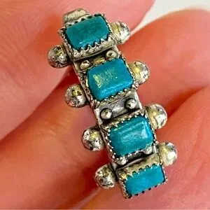 Vintage Sterling Silver Turquoise Screw Back Earrings Southwestern Native. These earrings feature four rectangular turquoise cabochons bezel-set with serrated edges, accented by applied sterling silver beads. Crafted in sterling silver with screw-back closures, typical of mid-20th century design. The earrings are marked STERLING on the screw-back posts, indicating vintage origin, likely 1940s–1960s Southwest artisan work.