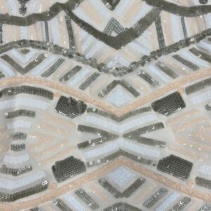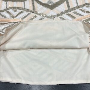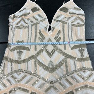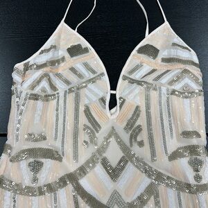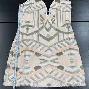 Free People Saylor Harper Sequin Shift Dress in size Small. This shift dress features a sultry plunging neckline and allover sequin embellishment. Low, strappy back with adjustable ties for an easy, effortless fit. Fully lined. One faint mark on the interior ONLY! I don’t understand how, as this dress was never worn or used. The mark is not visible while wearing, only on the liner. Measurements are shown in photos for exact fit.