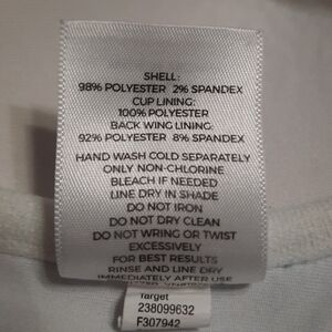 Shade & Shore polka dot bikini top, size 36DD. The shell is 98% polyester and 2% spandex. The cup lining is 100% polyester. The back wing lining is 92% polyester and 8% spandex.