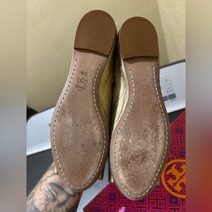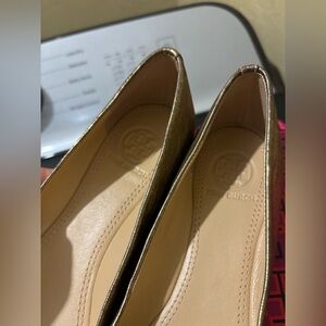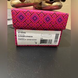 Excellent condition, Womens size 5 gold platinum colored Chase Ballet flats with large golden metallic bow design from Tory Burch. Please see all pictures for wear!