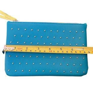 This set includes three chic pouches. One features a teal leaf pattern, another has a purple heart design, and the third is teal with gold studs. Perfect for organizing essentials.