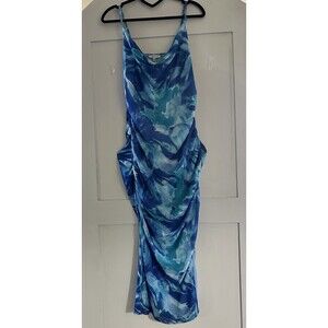 Women’s Blue Green Abstract Floral Cowl Neck Strappy Back Ruched Maxi Dress Sz S