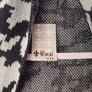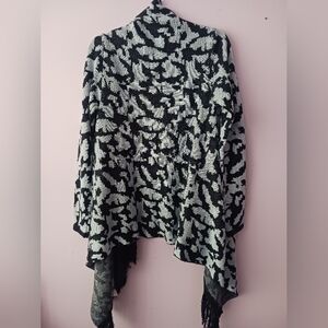 Elegant black and blue cardigan with animal print design. Features fringe detailing. Ideal for layering. Open front, soft stretchy sweater knit fabric..