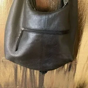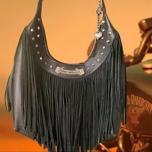Bold black hobo with fringe and silver studs. Features Harley-Davidson emblem.