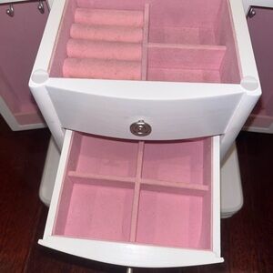 White jewelry organizer cabinet with multiple drawers for optimal storage. Perfect for keeping your accessories neatly arranged. It has a light pink interior with ring and necklace holders. Used