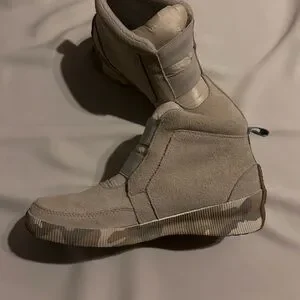 Great boots by Sorel with lots of life left! Features a light gray suede exterior. Cozy and warm for winter wear. Love a good slip on for colder weather!!