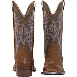 CLASSIC COWBOY STYLE: Designed to offer a blend of fashion and functionality, these womens cowboy boots feature a wide calf, square toe, traditional six-row stitch pattern, side pull loops, and vintage block heel