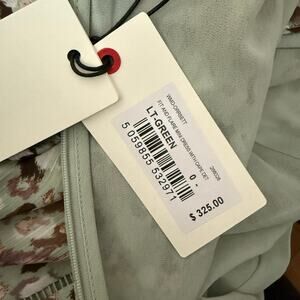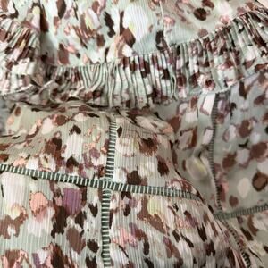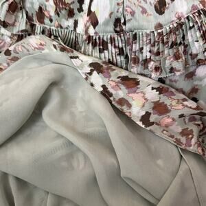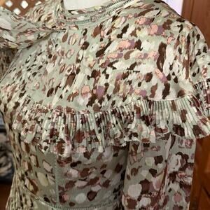 Ted Baker cape Orrsett mini dress, fully lined, long sleeves, round neckline with ruffled shoulder cape, ladder detail stitching throughout, beautiful cream, auburn brown and mauve paint stroke camouflage type specks against a gorgeous subtle mint green color way, even prettier in person, recycled materials, textured matte satin finish, women’s size 0 equivalent to a US 2 or 4, (fits true to a US size 2) new with tags NWT