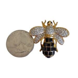 Adorable bumblebee adorned crystal rhinestones and black square cut crystal stones on a gold tone frame. Facet cut black crystal eyes. Beautiful detail. Measures 1-1/4” wing tip to wing tip and 1-1/4” long.