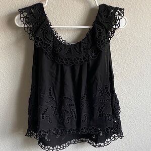Chic black blouse with eyelet design. Features ruffle accents. Perfect for stylish outings. In excellent condition;like new. Size is large. Brand is Sea New York.