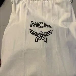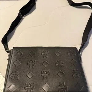 Elegant MCM messenger bag with embossed logo design. Crafted from premium black leather. Features adjustable strap for comfort.