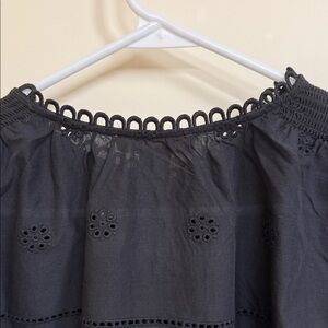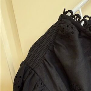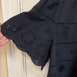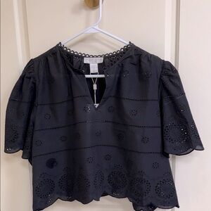 Chic black eyelet blouse with short sleeves. Perfect for versatile styling.