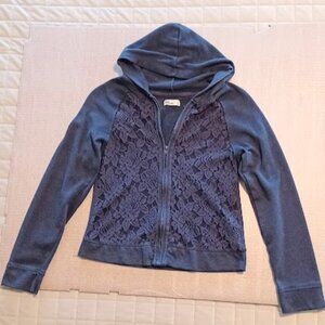Epic Threads Girls XL navy front lace full zip light jacket with hoodie. Body is 60% cotton, 40% polyester. Lace is 60% cotton, 30% nylon, 10% rayon. (18-inch long from neck back to hem) Like new in good condition