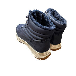 "These Baretraps BT Maine Midnight women's winter boots are navy blue, size 6 M. They feature a padded, high-top design with a lace-up closure, metal D-ring eyelets, and two-tone laces. A faux fur lining is visible at the collar. The attached tag indicates \"WATERPROOF TECHNOLOGY\" and a waterproof membrane. The boots are constructed with a beige midsole and a brown, lugged rubber outsole for traction. The upper is made of textile and man-made materials. They appear new with tags."