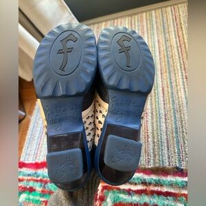 Nearly new! The Hopes Promise in navy blue and cream features a rounded toe, laser-cut F details, skinny laces, leather wrapped 2-in heel, rubber soles, navy blue and cream leathers. The blue leather is meant to look slightly pebbled. No flaws! No scuffs, marks, or stains -- these look nearly perfect. There is one small light scratch on the backof one heel (see photo). They can run short in the toe for some, so may work best for a 7.5.