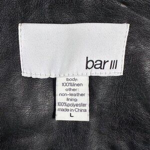 This edgy Bar III vest is crafted with a unique asymmetrical zip front in sleek black faux leather. This sleeveless jacket features contrasting tan linen panels for a modern, mixed-media look. The biker-inspired design includes a notched collar with snap details and functional zip pockets, adding a touch of rebellious chic to any outfit. Perfect for layering over tees or dresses to instantly elevate your style.