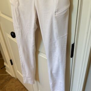 Elegant white perforate leggings by Athleta, size medium tall. So chic! New without tags. No flaws. Small hidden pocket in front waistband, with zippered pockets on each back/side (two total). Ideal for fitness and leisure. Washed but never worn. Approximate measurements laid flat unstretched: top of waistband 14.5”; rise 10.5”; inseam 28.5”