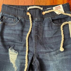 Chic dark blue skinny jeans with stylish distressed accents. Features a comfortable fit and trendy rope drawstring.