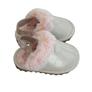 Keywords: Bearpaw slippers, infant slippers, baby girl shoes, faux fur slippers, pink and gray shoes, glitter slippers, elastic back strap shoes, toddler slippers, baby footwear, cozy slippers, size 4, new with box, 9-12 Months