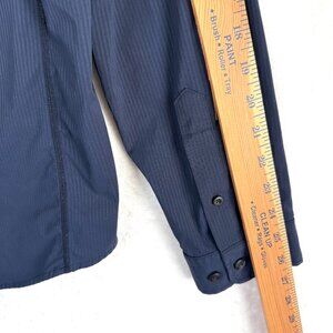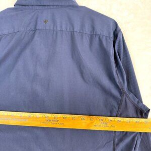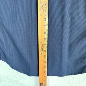 Size: XL, 45" chest size (size tag not available) Color: navy blue, micro striped pattern Neckline: collared, hidden oxford buttons Closure: full front buttons, partial hidden button placket Sleeves: long, buttoned cuffs, subtle vented under arm Hem: rounded Pocket: no pockets Lightweight Stretchy No tears, no stains in great condition