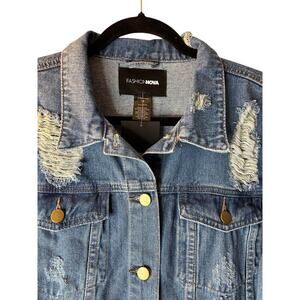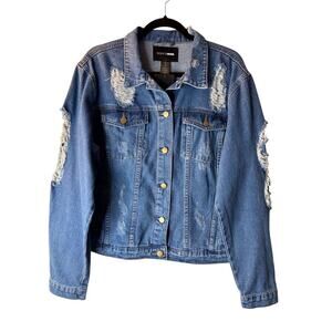 Fashion Nova Itz Fray Fray Jacket Medium Blue Wash size 1X Distressed Destroyed