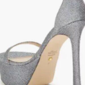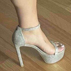 A barely-there sandal covered in shimmering fabric is perched atop a towering platform heel for an evening-ready look.