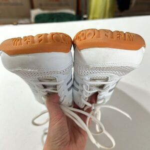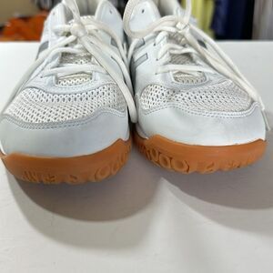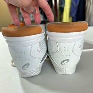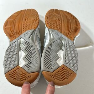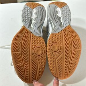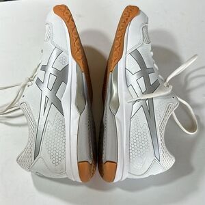 Lace-up style. Round toe. Breathable mesh. Gum rubber traction outsole. Gel cushioning. Vegan leather upper. White and silver. Court sports. Pickleball. Volleyball. Sporty. Workout. Active. Athletic.