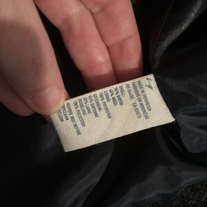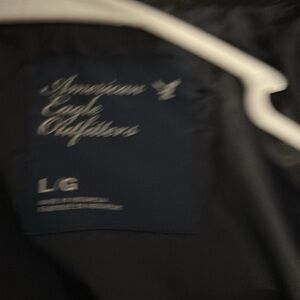 This American Eagle outfitter’s jacket is wool and lined. Has two zip up pockets.. the sleeve zip. Very warm in the winter time. Black and gray plaid flannel tartan type of wool material.