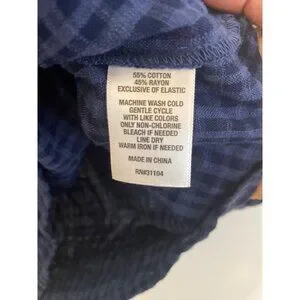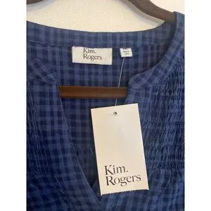 This navy plaid button-front shirt by Kim Rogers offers a versatile and polished look. Made from a cotton-rayon blend, it ensures comfort and durability.