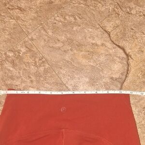 Sleek and vibrant leggings. Perfect for yoga or casual wear, they're like a burnt red-orange in color. 11 in across waist w/o stretching & 14 with stretching.