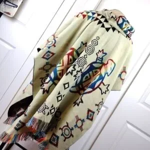 hooded Peruvian Poncho with Aztec Inca turtles.... turtle. hooded poncho ....fringed poncho ....48" tip to tip..... 37" long without the hood.... excellent, unused , like new condition...... stitches are in tact.... no pilling... . button closure on neck..... Burgundy, teal,. green, beige, black edge and multi color fringe all around the bottom.... Aztec..... turtle.... hooded poncho. .... vintage.. no signs of wear ...