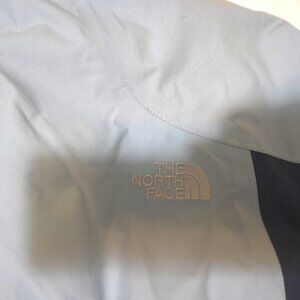 This is a women's XL North Face hooded winter jacket in a pale blue color with dark blue accent panels. There is a bungee cord at the waist, on the hood and multiple pockets at the waist, on the outer and inner chest, and on the upper part of each arm. The wrists have velcro. The coat closes with a zipper and has velcro closures that go over the zipper in order to block out the wind. It's in great condition with no visible wear, tears or stains. All the parts (zippers, bungee cords, etc.) work as they should. This jacket comes from a smoke-free home.