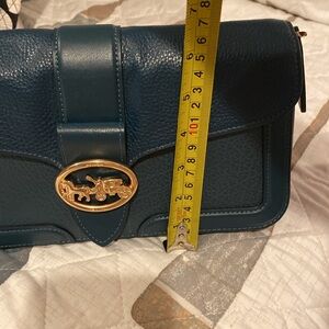 Coach Peacock ( Teal)leather crossbody , shoulder or clutch with stylish gold accents. Ideal for versatile wear. Both straps are removable. Outside slip pocket, inside slip pocket and small zip pocket.