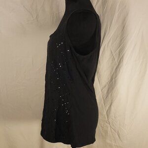 This black tank top from White House Black Market features an all-over sequin diamond pattern. The sleeveless design and lightweight fabric make it suitable for layering or wearing alone. A versatile piece for any wardrobe.
