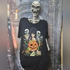 Black t-shirt featuring an Elvira Halloween graphic with skeletons and a pumpkin from Cavity Colors.