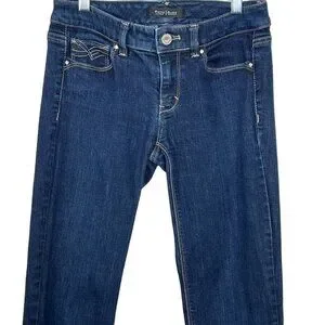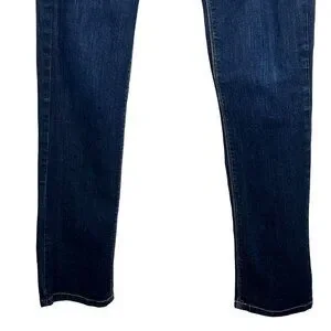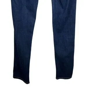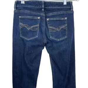 Stylish straight leg jeans. Dark blue color. Elegant stitching on back pockets. Perfect for casual wear.