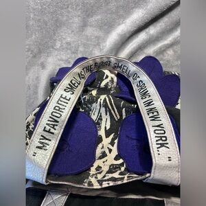 One strap reads “My favorite smell is the first smell of spring in New York.” While the other strap reads “Flowers c.1964 New York City”
