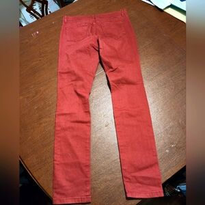 Trendy leggings jeans with distressed details. Bold burnt orange color for a standout look.
