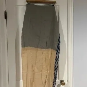 Elevate your look with this stylish striped scarf. Featuring a blend of blue, tan, and cream colors, it adds a touch of elegance to any outfit. 40 x 80 inch rectangle by Beck Sondergaard, purchased in Amsterdam.