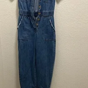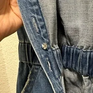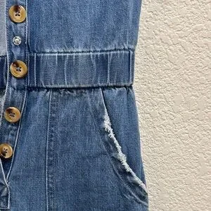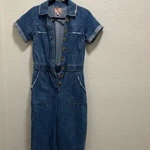 Stylish denim jumpsuit with button front. Features short sleeves and pockets. Perfect for casual wear.