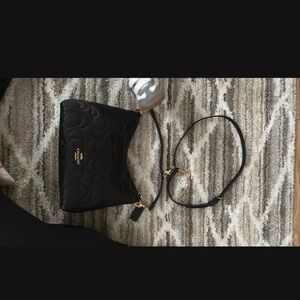 Sophisticated black shoulder bag by Coach. Features embossed design and gold-tone details. Perfect for any occasion.
