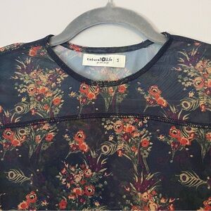 Natural Life Sloane Floral Mesh Long Sleeve Boho Crewneck Shirt Top Black Small
