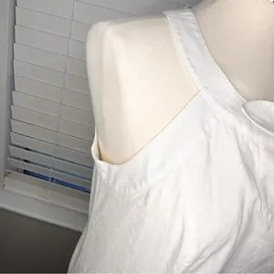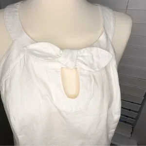 This crisp white tank top from Vineyard Vines is a must-have for your warm-weather wardrobe. Made from a comfortable and breathable cotton blend, it features a unique front design with a subtle cut-out and a playful bow detail at the neckline. The sleeveless halter cut is both flattering and on-trend, perfect for a chic, casual look.