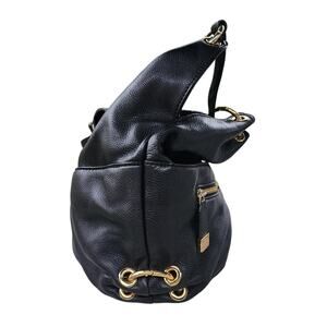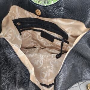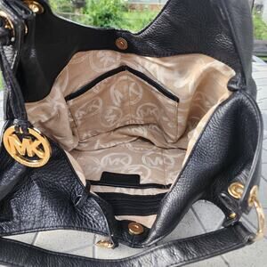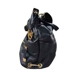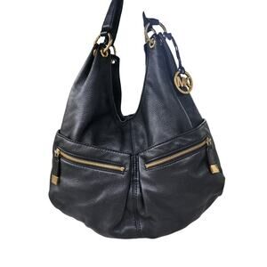 VTG: Stylish, black "Layton" pebbled leather large hobo handbag with gold tone hardware / dual strap handles / magnetic snap closure / MK hangtag charm / multiple zip & slot pockets / signature fabric interior / gold tone accent rings / logo emblems by Michael Kors.