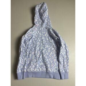 Girls Champion hoodie, size XS. Light blue with allover white + pink leopard print and pink Champion script logo across the chest. Pullover style with front kangaroo pocket and ribbed cuffs/hem. Cozy fleece interior makes it perfect for school, casual wear, or lounging.