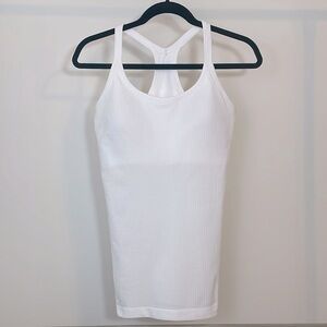 Bright white ribbed racer back tank with built in self bra and removable padding. Ideal for workouts or casual wear. Lightweight with a trim long fit. Barely worn and in EUC with no stains or flaws.