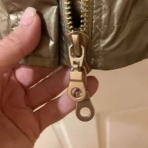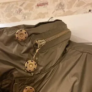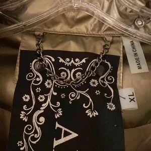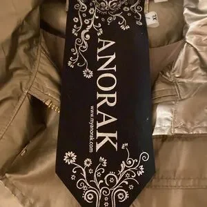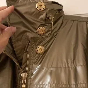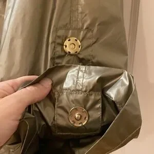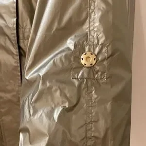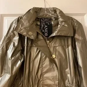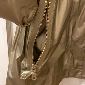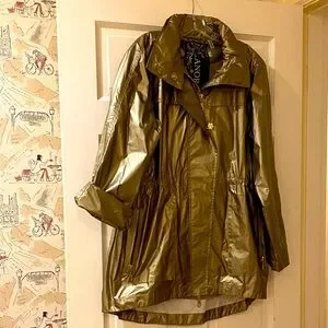 ANORAK metallic muted gold rain coat. Sz. XL. Concealed hood. Fold up sleeves with gold snaps. Please see pics. Have photographed with one sleeve snapped up and the other down. Zipper and snap closures. Zipper pockets. Interior drawstring waist. Lined. Is a light to light medium weight. Ideal for those rainy days. In excellent condition. No seeable flaws.