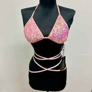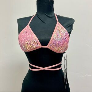 Club Exx x Dolls Kill sequin triangle bikini top coral stretchy. Gorgeous iridescent pink sequins adorn cups as shown. Extra long stretchy ties to wear in multiple styles as shown. New with tags. Bought for myself but cups are too small. This would fit a B/C cup. Lined as shown. Super sexy club wear! Perfect for summer and festival season. Size L. Measurements in photos.